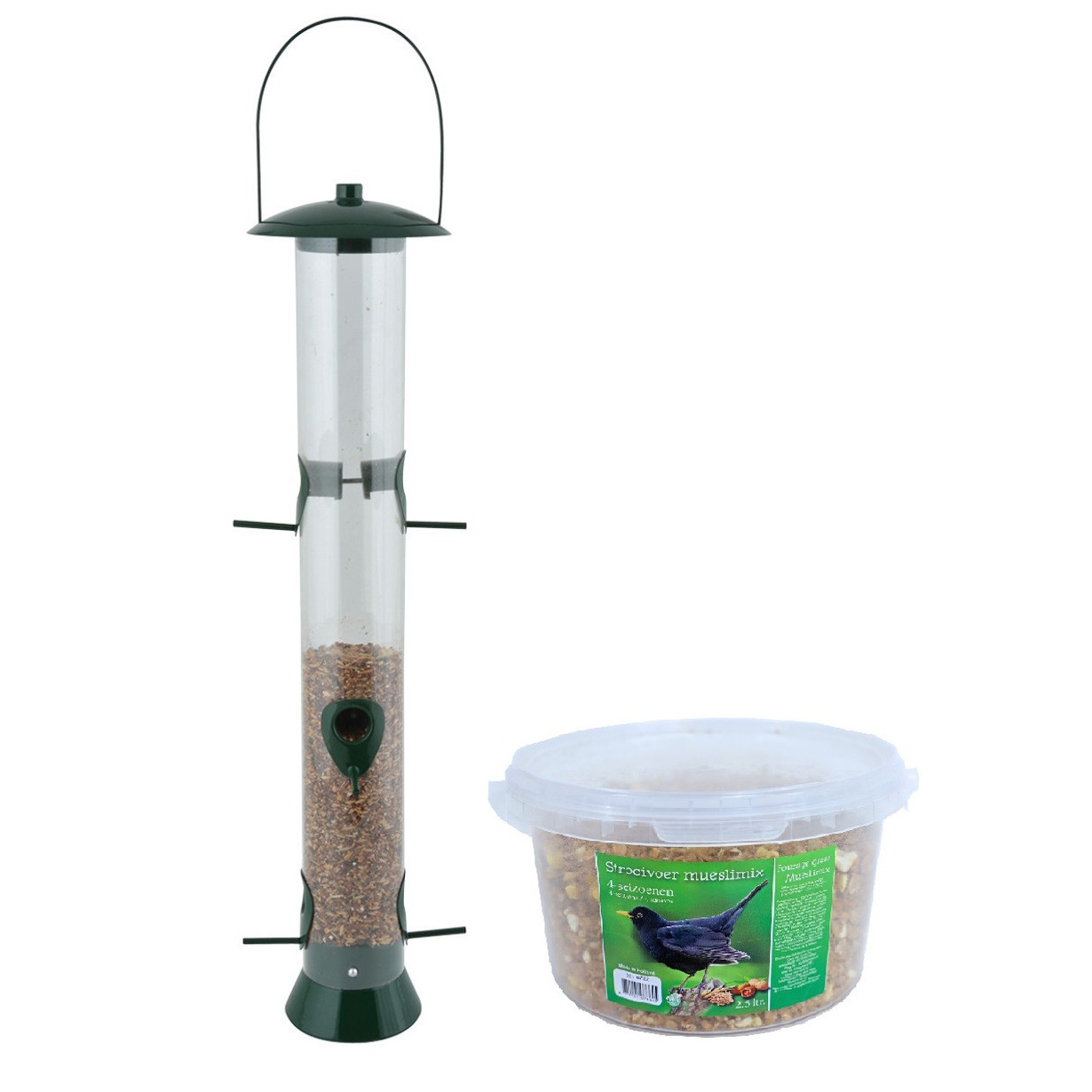 Grote vogel voedersilo kunststof 56 cm inclusief 4-seizoenen mueslimix vogelvoer. Deze vogelvoer silo beschikt over 6 gaten waar vogels uit kunnen eten en is eenvoudig bij te vullen door het dakje omhoog te schuiven. De vogelvoedersilo is gemakkelijk op te hangen aan een tak of haakje. Het voer is bijzonder voedzaam en voorzien van alle benodigde prote?nen en vitaminen voor allerlei soorten tuinvogels. De ingredi?nten van het strooivoer zijn zo samengesteld dat ze het hele jaar door aan vogels gevoerd kunnen worden. Afmeting: ca. 15 x 15 x 56 cm. Materiaal: kunststof, metaal. , Dit artikel bestaat uit:, 1x Vogelvoer strooivoer mueslimix 4-seizoenen 2,5 liter, 1x Best for Birds Voedersilo – vogelvoederplek – 56 cm – kunststof voederstation