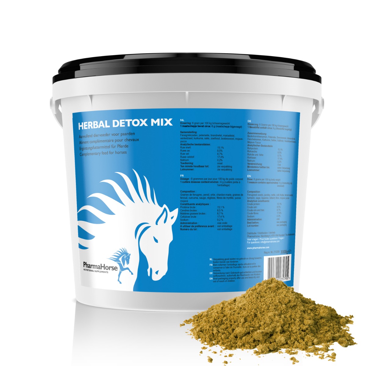 Onze Detox Mix is samengesteld met zorgvuldig geselecteerde natuurlijke ingrediënten, waaronder fenegriekzaden, peterselie, brandnetel, mariadistel, venkelzaad, kurkuma, salie, zoethout, bosbesvezel en mojave-yucca. Dit ondersteunt je paard bij het verwijderen van ongewenste stoffen en onzuiverheden, en het herstel van zijn natuurlijke balans.