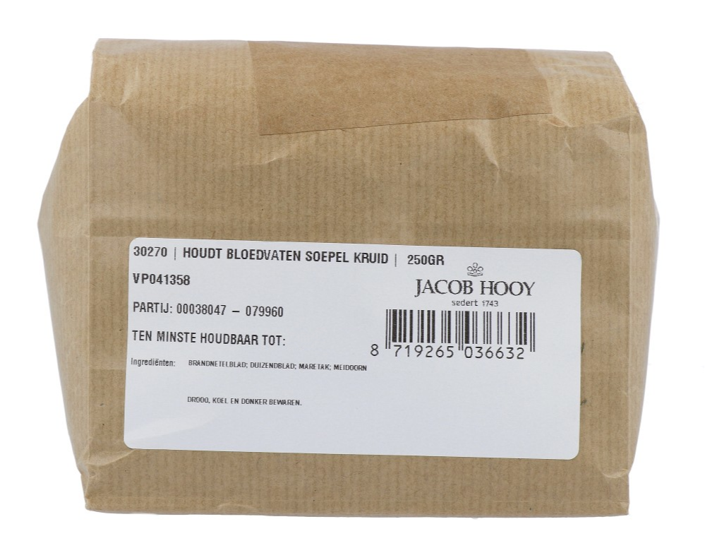 Jacob Hooy Houdt Bloedvaten Soepel Kruid is een zorgvuldig samengesteld kruidenmengsel op basis van een traditioneel recept van Jacob Hooy. Dit mengsel bevat een selectie van kruiden (Brandnetelblad, Duizendblad, Maretak, Meidoorn) Jacob Hooy Houdt Bloedvaten Soepel