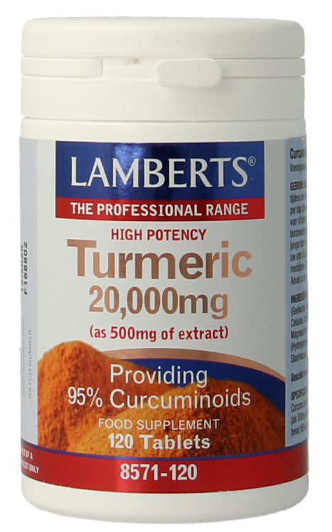 Lamberts Curcuma 20.000mg Tabletten (120 stuks) is een voedingssupplement met hoge sterkte curcuma extract. Het bevat 500mg curcumawortel extract gestandaardiseerd op 95% curcumine, wat overeenkomt met 20.000mg curcumakruid. Lamberts Curcuma 20.000mg Tabletten:Bevat