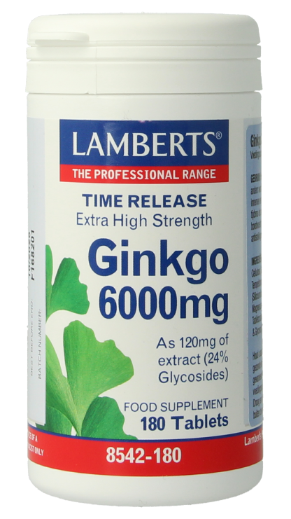 Lamberts Ginkgo 6000mg Time Release Tabletten (180 stuks) is een voedingssupplement met hoge sterkte ginkgo biloba extract. Elke tablet bevat 120mg extract, equivalent aan 6000mg gedroogd ginkgo blad, gestandaardiseerd op 24% glycosiden. Lamberts Ginkgo 6000mg Time Release