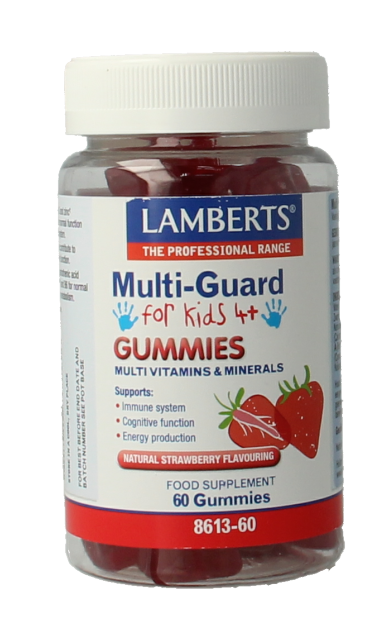 Lamberts Multi-Guard For Kids Gummies zijn smakelijke gummies speciaal ontwikkeld voor kinderen van 4 tot 14 jaar, boordevol essentiële vitaminen en mineralen om hun dagelijkse voeding aan te vullen. Elke gummie bevat belangrijke voedingsstoffen zoals vitamine A, C, D, E,