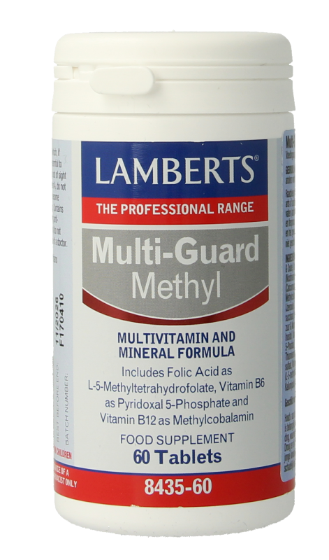 Lamberts Multi-Guard Methyl Tabletten (60 stuks) is een krachtige één-per-dag multiformule bevat goed opneembare vormen van cruciale nutriënten, zoals foliumzuur als methylfolaat, vitamine B6 als pyridoxaal-5-fosfaat, en vitamine B12 als methylcobalamine. Daarnaast is ook