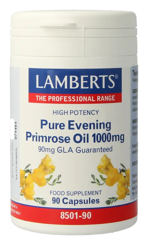 Lamberts Teunisbloemolie 1000 mg Capsules (90 stuks) bevatten een hoog gehalte aan meervoudig onverzadigde vetzuren (MOV), zoals linolzuur (LA) en gammalinoleenzuur (GLA). Teunisbloemolie is één van de weinige rijke natuurlijke bronnen van GLA. Elke capsule levert