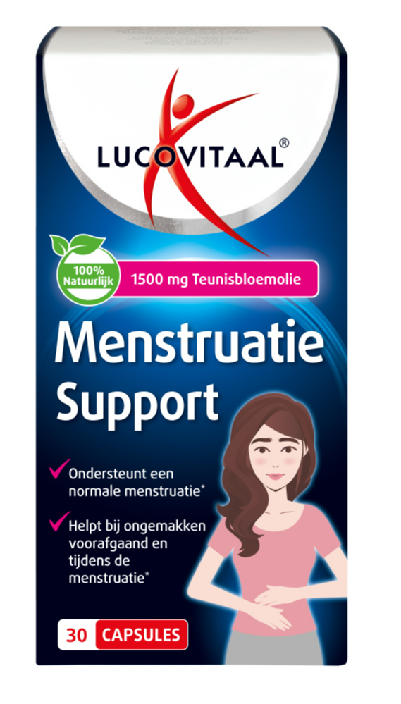 Lucovitaal Menstruatie Support is 100 % natuurlijk en bevat 1500 mg teunisbloemolie, wat rijk is aan onverzadigde vetzuren en onder andere helpt bij wisselende stemmingen en ongemakken voorafgaand en tijdens de menstruatie*. Daarnaast voedt het de huid van binnenuit en