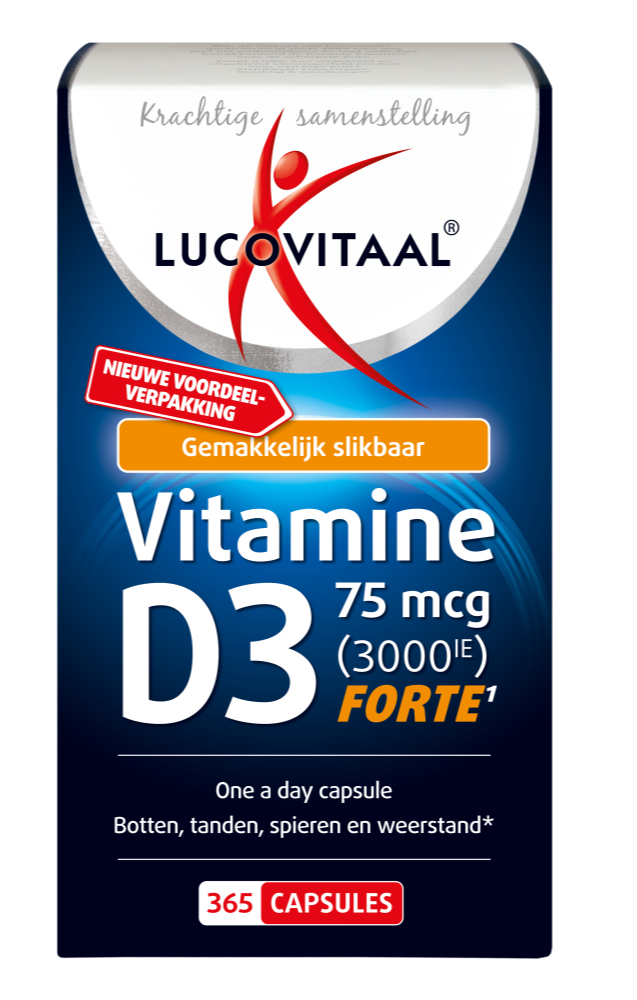 Lucovitaal Vitamine D3 75mcg Forte Capsules bevatten maar liefst 75mcg vitamine D3 per kleine, gemakkelijk slikbare capsule. Vitamine D verhoogt de opname van kalk in de botten en het draagt bij aan een normaal immuunsysteem. Ook draagt het bij aan het behoud van sterke
