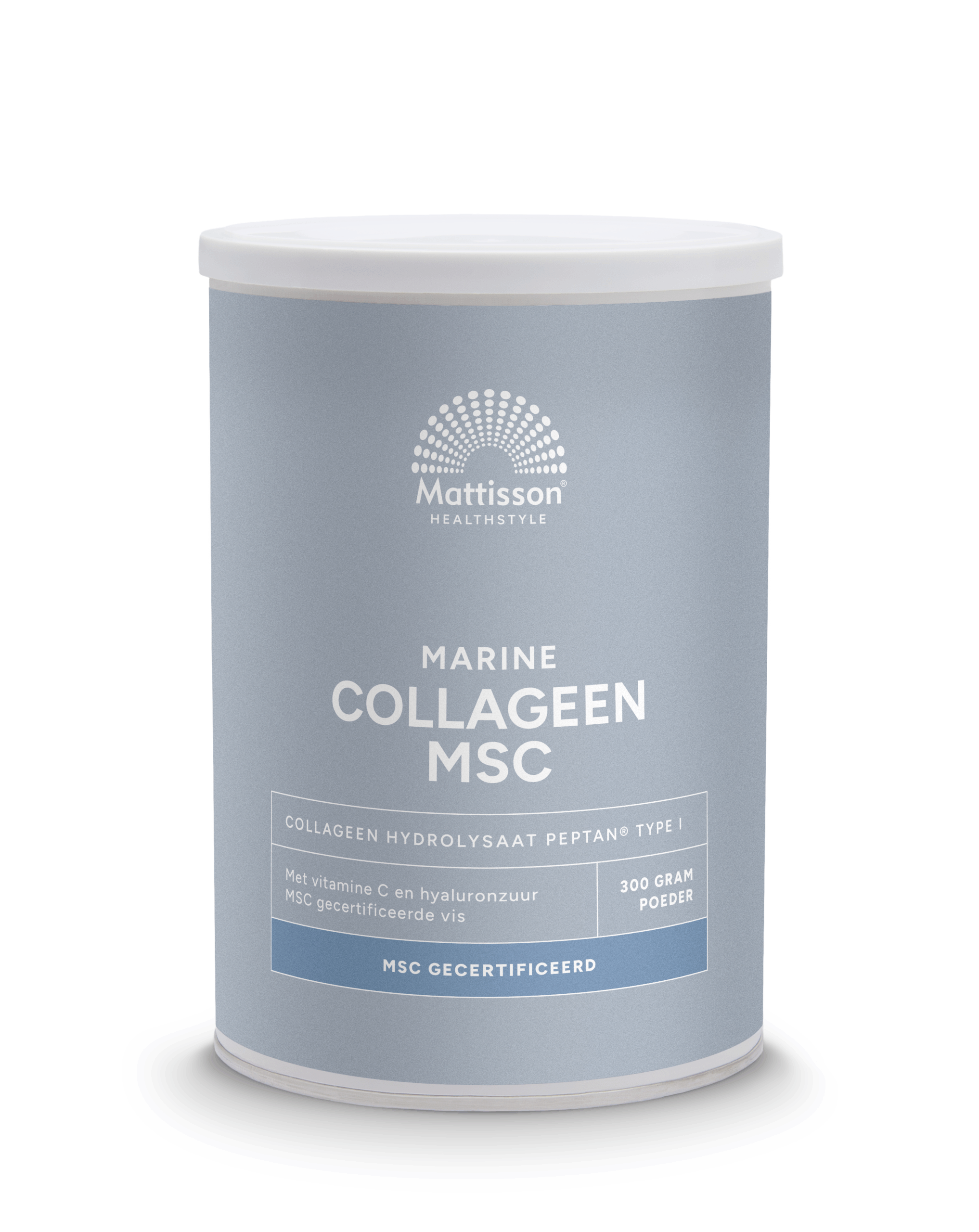 Mattisson HealthStyle Marine Collageen Peptan® Blend MSC (300 gram) is een blend van MSC-gecertificeerde viscollageen (o.a. wilde kabeljauw), vitamine C en hyaluronzuur. Collageen is een lichaamseigen eiwit dat van nature voorkomt in huid, gewrichten, botten, spieren en