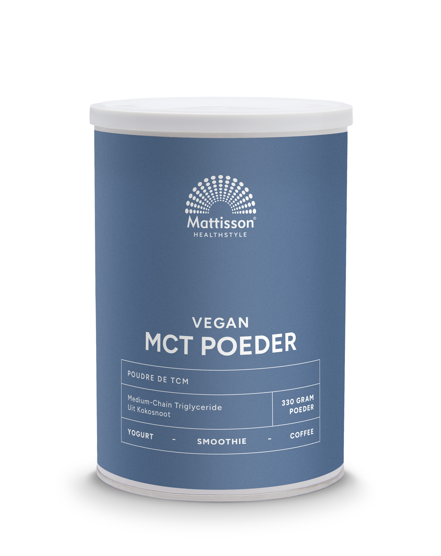 Mattisson HealthStyle Vegan MCT Poeder Coconut Pure is een 100% vegan poeder dat gebruikt kan worden ter vervanging van melk(poeder) in bijvoorbeeld koffie. Het poeder is gemaakt op basis van 30% acaciavezel en verrijkt met onder andere MCT Olie uit kokosolie. MCT (Medium