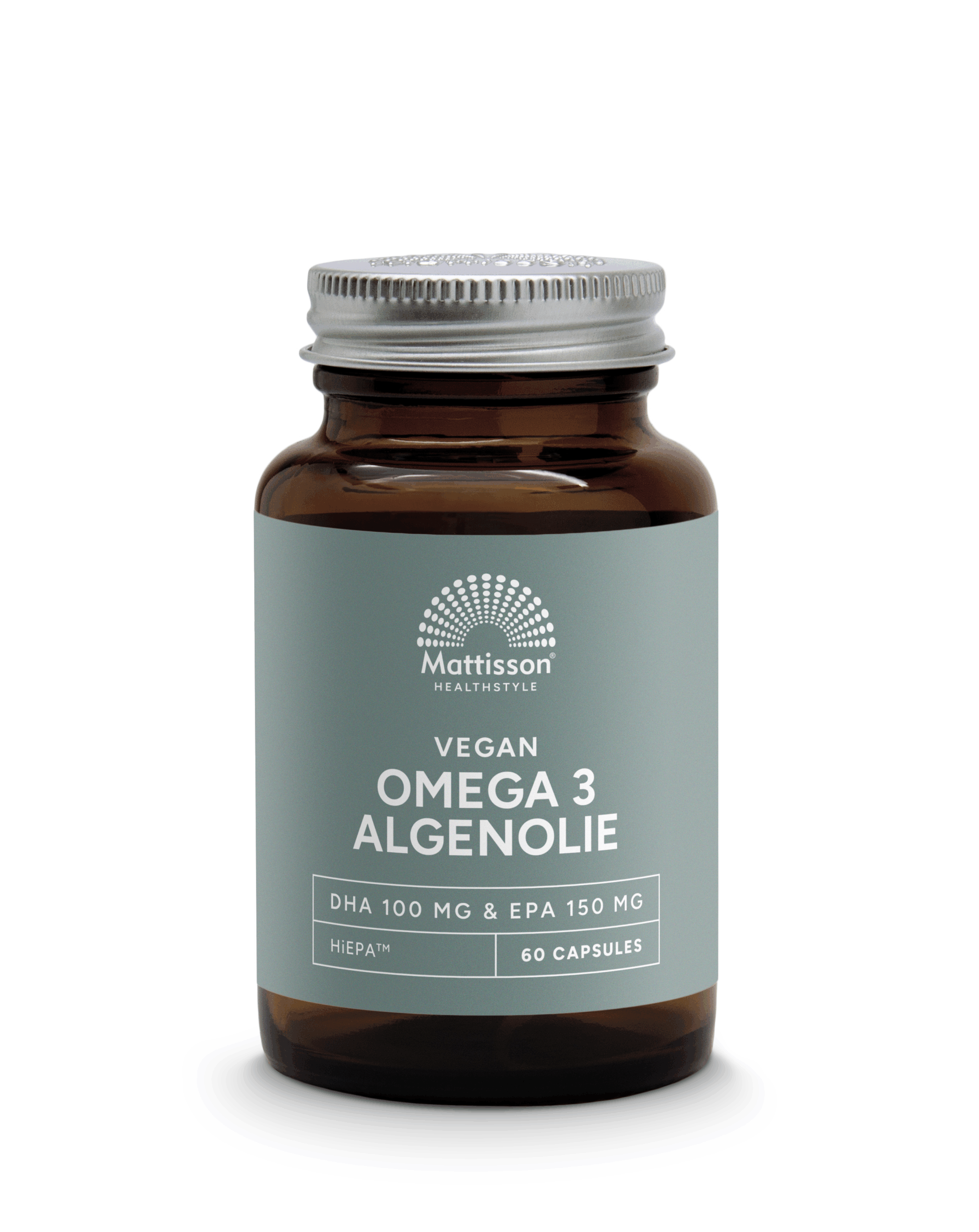 Mattisson Vegan Omega 3 Algenolie Capsules (60 stuks) bevatten per capsule 150 mg EPA & 100 mg DHA in hun natuurlijke triglyceridenvorm. Vegan Algenolie is een duurzaam gekweekt omega-3-supplement, geproduceerd in een zuivere, gesloten omgeving en vrij van verontreiniging.