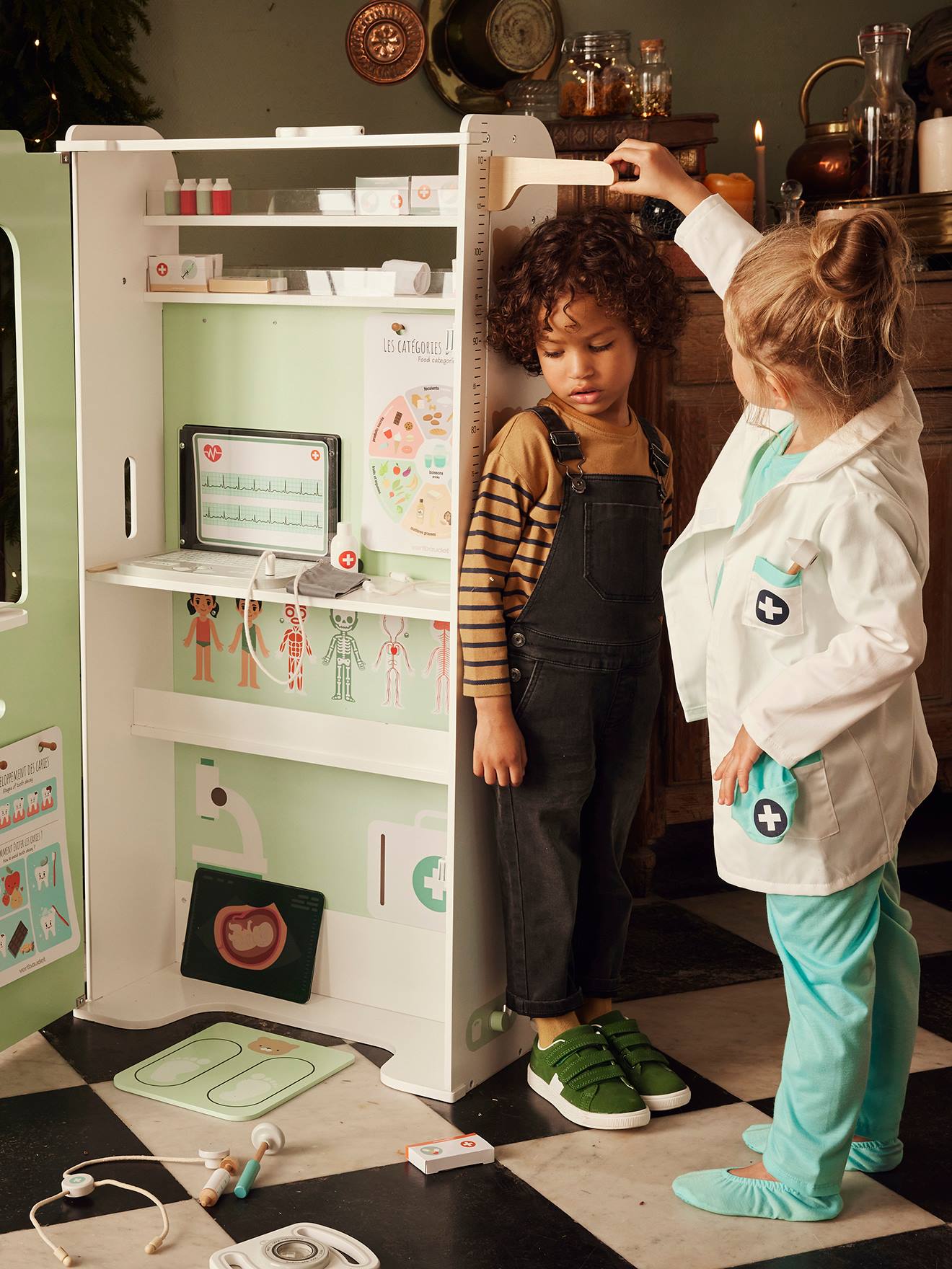 Weegschaal, ršntgenfoto’s, stethoscoop, leerkaarten en nog veel meer onmisbare accessoires om doktertje te spelen! Uw kind zal het geweldig vinden om dit medisch centrum in zijn of haar kamer op te zetten om spelenderwijs te leren over de wereld van de zorg. Een spel van imitatie dat ook zijn verbeelding zal oefenen… en waarom niet, een mooie roeping opwekken? Deur met magnetische sluiting voor toegang tot het centrum met een brievenbus en een loket + 2 legplanken voor accessoires Op de achterkant een krijtbord met posters en planken 1 zijde met een weegschaal + een beweegbare steun onderaan met een handvat om het gewicht aan te geven; 1 zijde met een klok Aan elke kant een handvat om het centrum gemakkelijk te verplaatsen Talrijke accessoires: 3 dozen vaccins, 3 dozen geneesmiddelen, 3 dozen verband, 4 flacons, 1 fles mercurochroom, 1 reflexhamer, 1 otoscoop, 1 injectiespuit, 1 spatel, 1 stethoscoop, 1 fles ontsmettingsmiddel met drukknop, 1 biometrische thermometer, recto/verso ršntgenkaarten: borstkas/schedel, bekken/knie, echokaart, recto/verso kaart bloeddruk/EEG, temperatuurkaart Binnenin met houten haakjes om de 6 dubbelzijdige leerkaarten aan op te hangen: ontwikkeling van de foetus/groei, het skelet/de organen, vitaminen/voedselcategorie’n, gebit/ontwikkeling van gaatjes + voorkomen ervan, goed handen wassen/pijnschaal, ogentest/kleurenmeting voor kleurenblinden met een houten stokje; 1 ršntgenhouder met schuifsysteem om ršntgenkaarten af te drukken, plankje met bedrukte toetsen, 1 echo-apparaat en 1 houder met weergave voor ršntgenfoto’s Afmetingen Hoogte 115 cm Lengte 56 m mrt gesloten deur, 125 cm met open deur Breedte 25 cm Meer informatie Vanaf 3 jaar Zelf in elkaar zetten Om imitatiespel aan te moedigen, om kinderen in staat te stellen medische afspraken beter te begrijpen en hen te helpen hun gewaarwordingen te identificeren Bevordert de fantasie en creativiteit Opgelet! Niet geschikt voor kinderen jonger dan 36 maanden. Medisch centrum gemaakt van FSC¨ hout