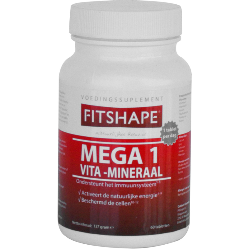Fitshape Mega 1 is een speciale multivitamine voor sporters die hun dagelijkse voeding willen ondersteunen met vitaminen, mineralen, spoorelementen en antioxidanten. Als fervente sporter vraag je veel van je lichaam. Hoe goed je ook eet, je houdt altijd tekorten aan essentiële vitaminen en mineralen. Met Fitshape Mega 1 vul je ze zo aan. Het activeert de natuurlijke energie en beschermt de cellen.DoseringEén tablet bij de maaltijd. Innemen met ruim water of vruchtensap.Een voedingssupplement is geen vervanging van een gevarieerde voeding en een gezonde leefstijl.