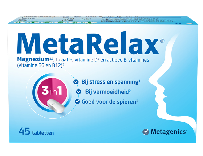 MetaRelax® is een compleet magnesiumcomplex te gebruiken bij de ondersteuning van de psychologische functie zoals bij stressmomenten (dankzij folaat), vermoeidheid (folaat, magnesium en vitamine B6) en ter ondersteuning van de spieren (magnesium en vitamine D).MataRelax