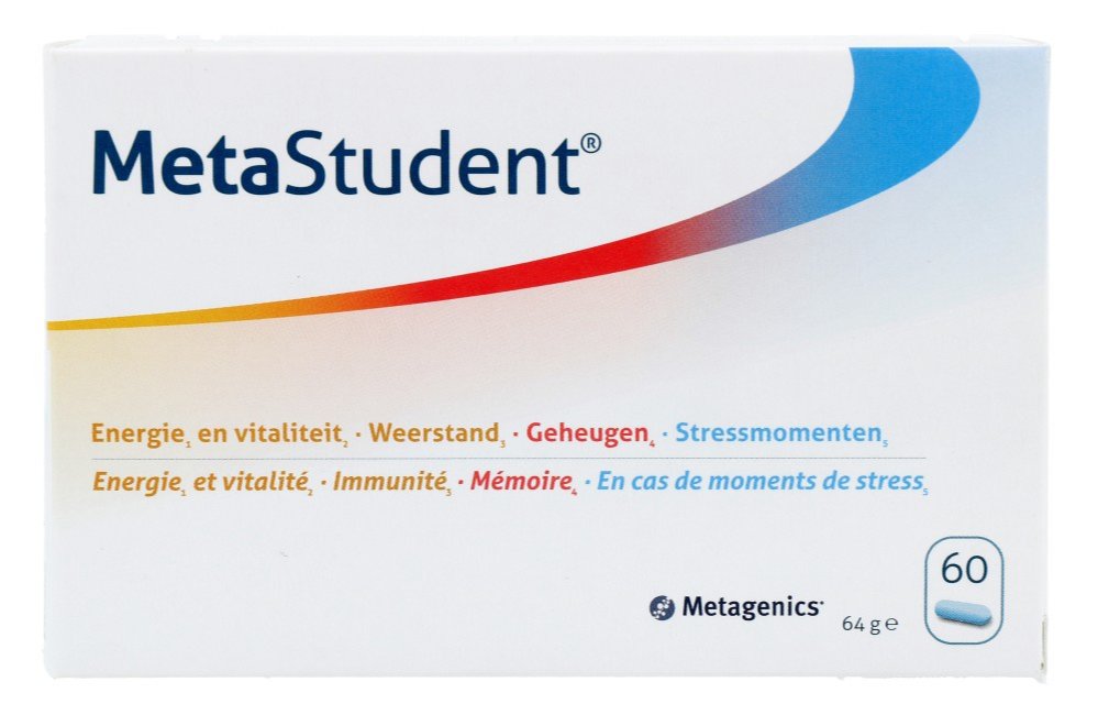 Metagenics MetaStudent Tabletten ondersteunt het normale energieniveau (vit B1, B2, B3, B5, B6, B12), en draagt bij tot een normale werking van het immuunsysteem (vitamine D, zink, vitamine C, selenium). Dit voedingssupplement draagt bij tot een normale cognitieve functie