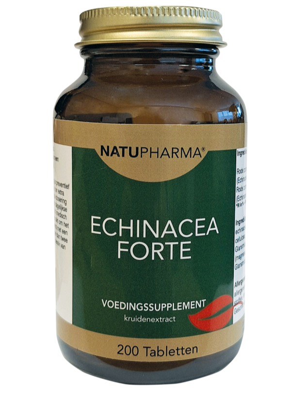 Natupharma Echinacea Forte Tabletten (200 stuks) is een voedingssupplement op basis van Rode Zonnehoed (Echinacea purpurea). Echinacea ondersteunt het immuunsysteem* en heeft daarnaast een verzachtende invloed op de luchtwegen*. Natupharma Echinacea Forte Tabletten:Echinacea