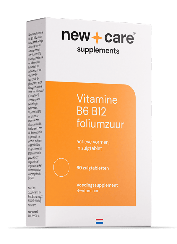 New Care Vitamine B6, B12, Foliumzuur Zuigtabletten (60 stuks) is een zuigtablet met biologisch actieve vormen van vitamine B6, B12 en foliumzuur, die goed door het lichaam worden opgenomen. Het product voldoet aan de normen van het NZVT systeem en is getest op de