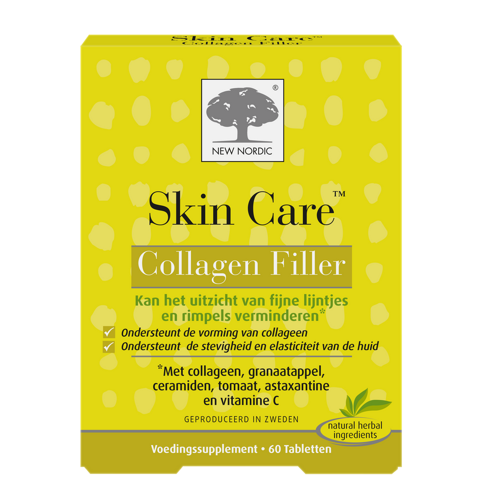 New Nordic Skin Care Collagen Filler Tabletten (60 stuks) gaat fijne lijntjes en rimpels te lijf van binnenuit. Dit skincare supplement is gebaseerd op maritiem collageen en op het gestandaardiseerde extract van granaatappel, tomaat en natuurlijke astaxanthine. De collageen