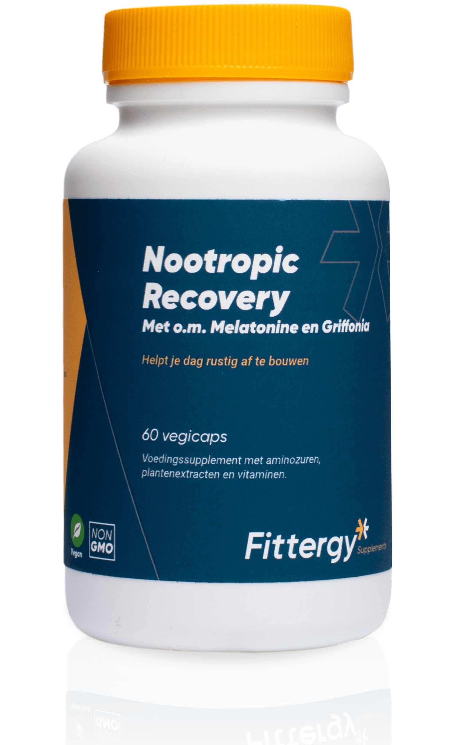 Fittergy Nootropic Recovery is speciaal ontwikkeld om je te helpen ontspannen na een drukke dag. Dit supplement maakt deel uit van het Fittergy Nootropic Ritueel, een lijn van drie supplementen die elkaar gedurende de dag aanvullen. De producten zijn ook los verkrijgbaar, zodat je ondersteuning kunt kiezen op het moment dat jij het nodig hebt.