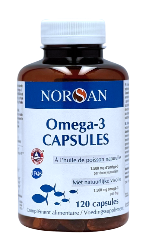Norsan Omega-3 Capsules (120 stuks) bevatten een unieke combinatie van natuurlijke, niet-geconcentreerde visolie uit wilde visvangst. Het product is verrijkt met rozemarijnextract als antioxidant en is hoog gedoseerd. Deze capsules bevatten pure en zuivere visolie met een