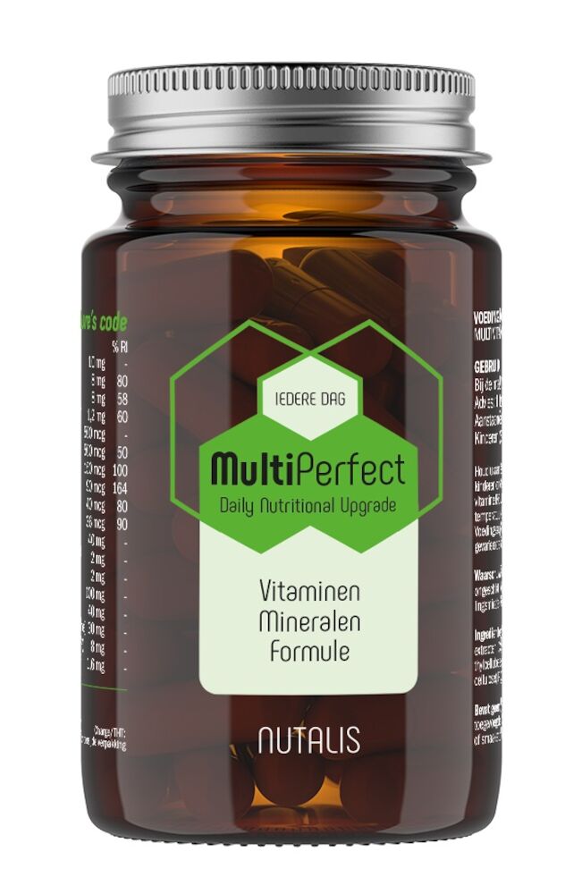 Nutalis Multi Perfect Vitaminen Mineralen Formule is een voedingssupplement dat een zeer evenwichtige mix van multivitamines en mineralen bevat. Daarbij bevat het 35 micronutriënten die van levensbelang zijn en 70 spoorelementen van mariene oorsprong. Deze bijzondere mix is