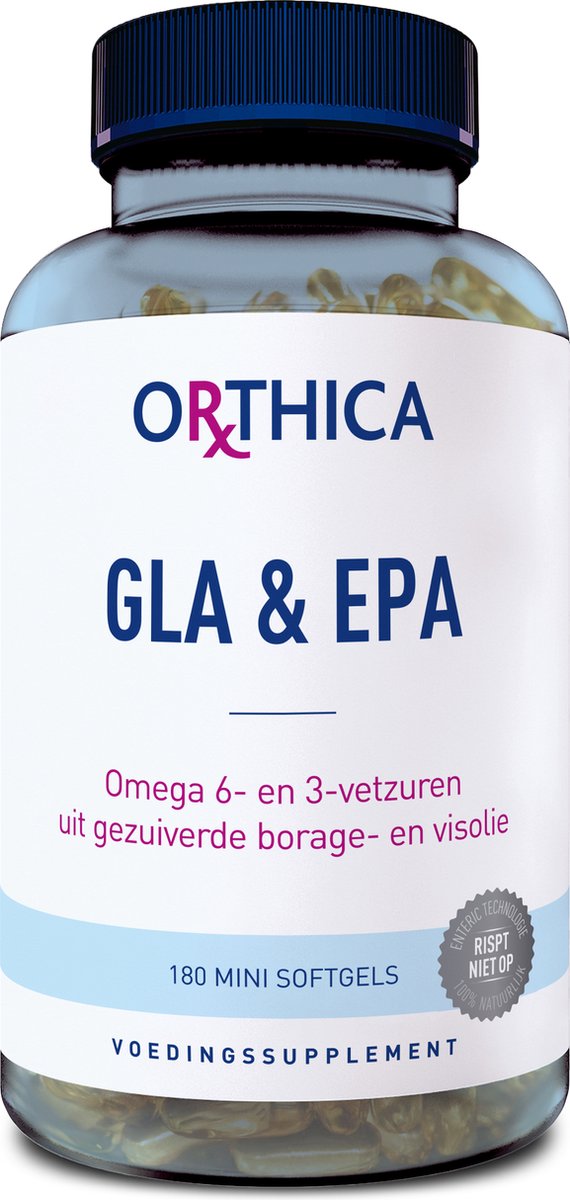 Orthica GLA & EPA is een kwalitatief voedingssupplement dat rijk is aan de onverzadigde vetzuren omega 3 en -6 uit gezuiverde borage- en visolie. Doordat onze voeding niet altijd genoeg van deze vetzuren bevat of omdat u bijvoorbeeld geen vis eet kan een supplement als