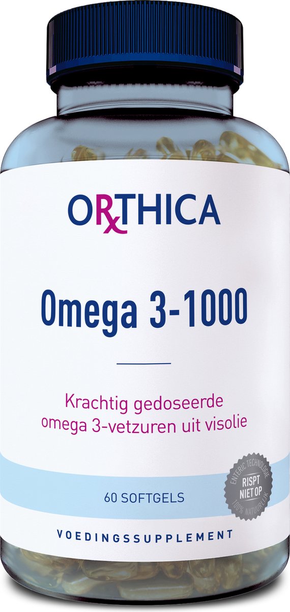 Orthica Omega 3-1000 Softgels is een krachtig visolie preparaat met 1000 mg omega 3-vetzuren per softgel met natuurlijke tocoferolenmix. Aangezien we via onze voeding vaak niet voldoende omega-3 vetzuren binnen krijgen, is Orthica Omega 3-1000 perfect om te gebruiken als
