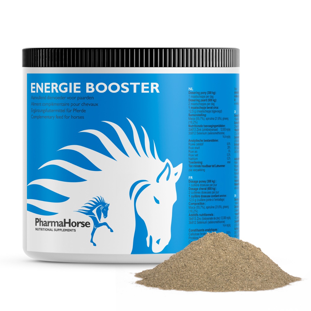 PharmaHorse Energie Booster is een zorgvuldig samengestelde formule die Maca, Spirulina, Ginseng, Zink en Selenium combineert om je paard te ondersteunen bij optimale prestaties.
