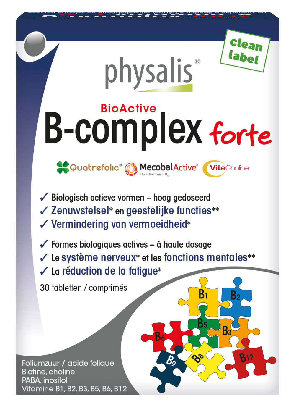 Physalis BioActive B-complex Forte Tabletten is een hooggedoseerd vitamine B-complex met alle belangrijke B-vitamines, in biologisch actieve, best opneembare vorm. Het voordeel hiervan is dat deze niet eerst omgezet hoeven te worden alvorens als co-enzym werkzaam te kunnen