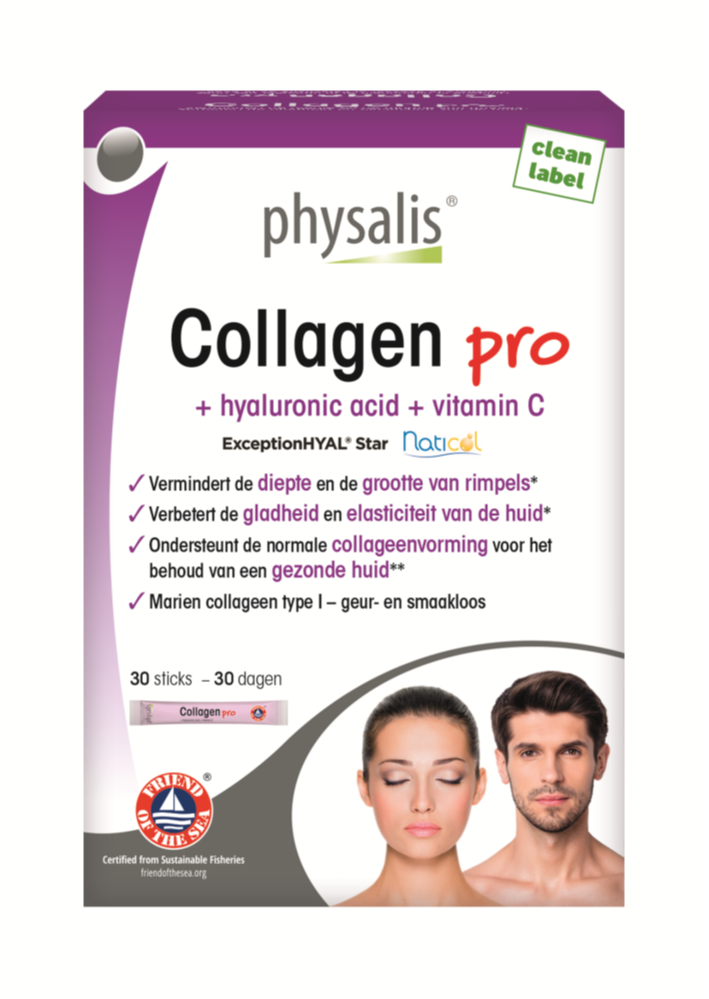 Physalis Collagen Pro Sachets (30st) is een oplosbaar mengsel met collageen, vitamine C en hyaluronzuur. NaticolĀ® is een zeer pure vorm van collageen type I uit vis waarvan de werking onderbouwd is door verschillende studies. Het wordt geproduceerd via een uniek proces