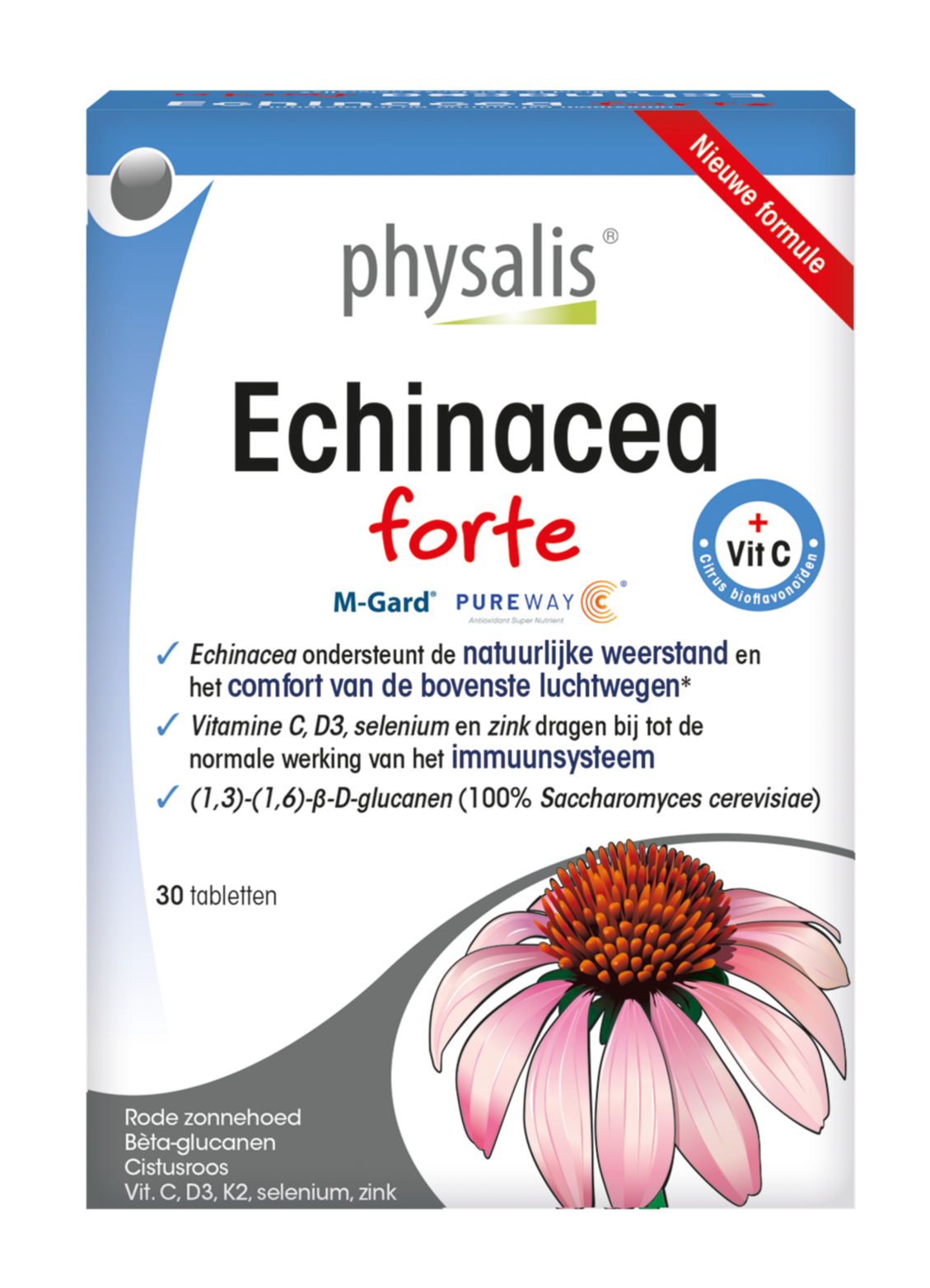 Physalis Echinacea Forte met Echinacea ondersteunt de natuurlijke weerstand* en draagt bij tot het comfort van de bovenste luchtwegen*. Daarnaast is er Vitamine C, D3 en selenium en zink toegevoegd, deze ingrediënten dragen bij tot de normale werking van het immuunsysteem.