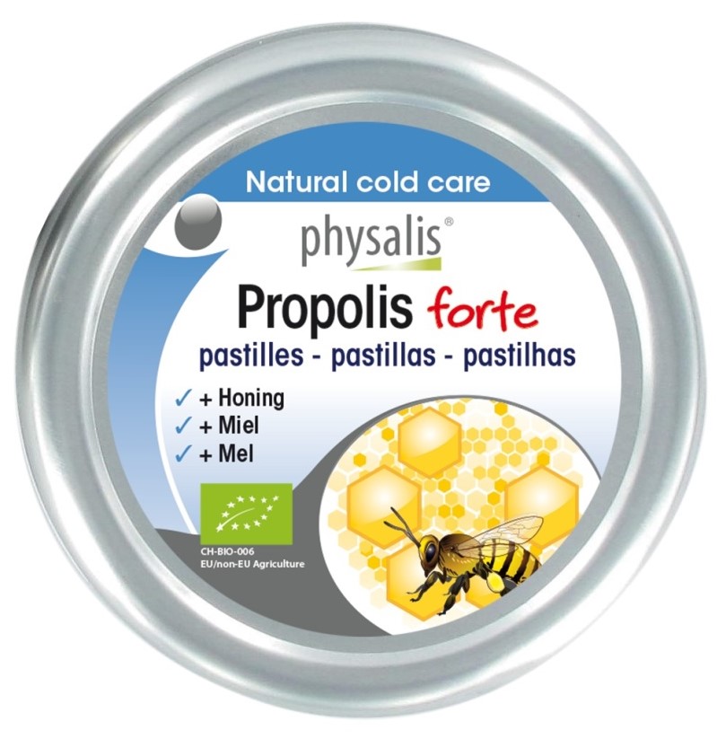 Physalis Propolis Forte Pastilles zijn zuigtabletten op basis van honing en hebben een verlichtende en kalmerende werking op de keel. Door de extracten van vlier, rode zonnehoed, heemst, tijm en eucalyptus wordt de natuurlijke weerstand als mede de bovenste luchtwegen