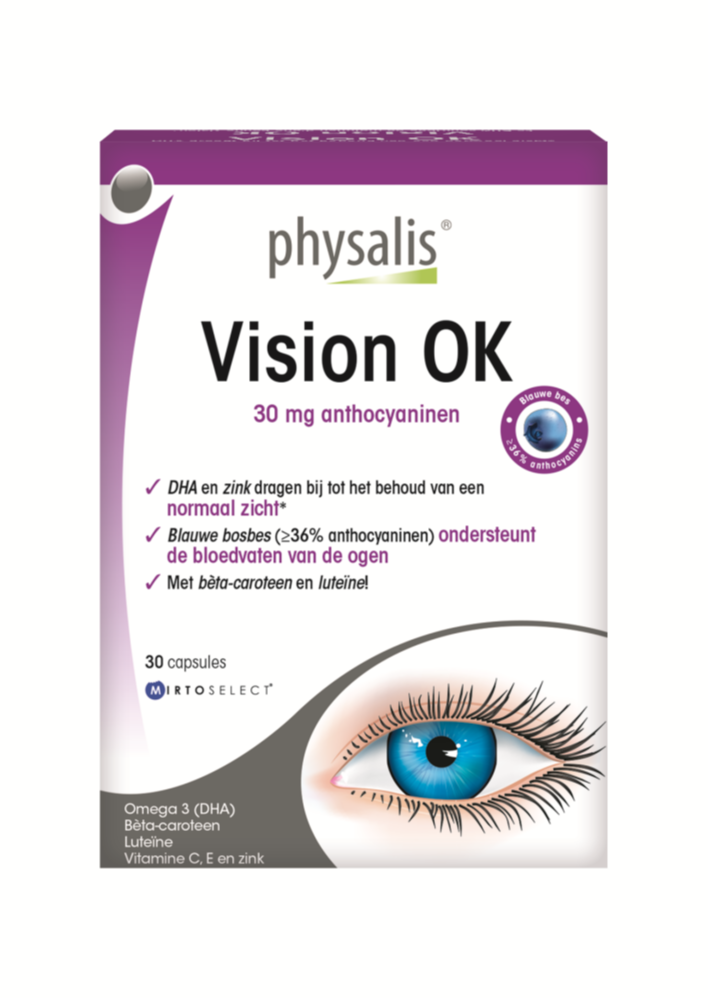 Physalis Vision OK bevat zink en visolie met 70% omega 3-vetzuur DHA die met een dagelijkse inname van 250mg bijdragen tot de instandhouding van een normaal gezichtsvermogen. De werking wordt versterkt door het toegevoegde natuurlijke bèta-caroteen, dat in het lichaam wordt