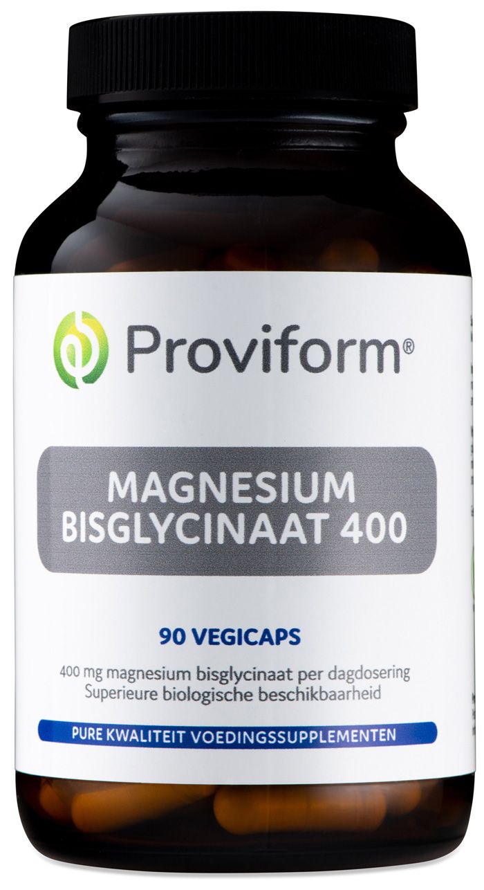Proviform Magnesium Bisglycinaat 400, magnesium bisglycinaat is een goed opneembare vorm van magnesium. Magnesium draagt bij aan de normale werking van de spieren en draagt bij aan de normale werking van het zenuwstelsel. DoseringDrie vegetarische capsules per dag bij de