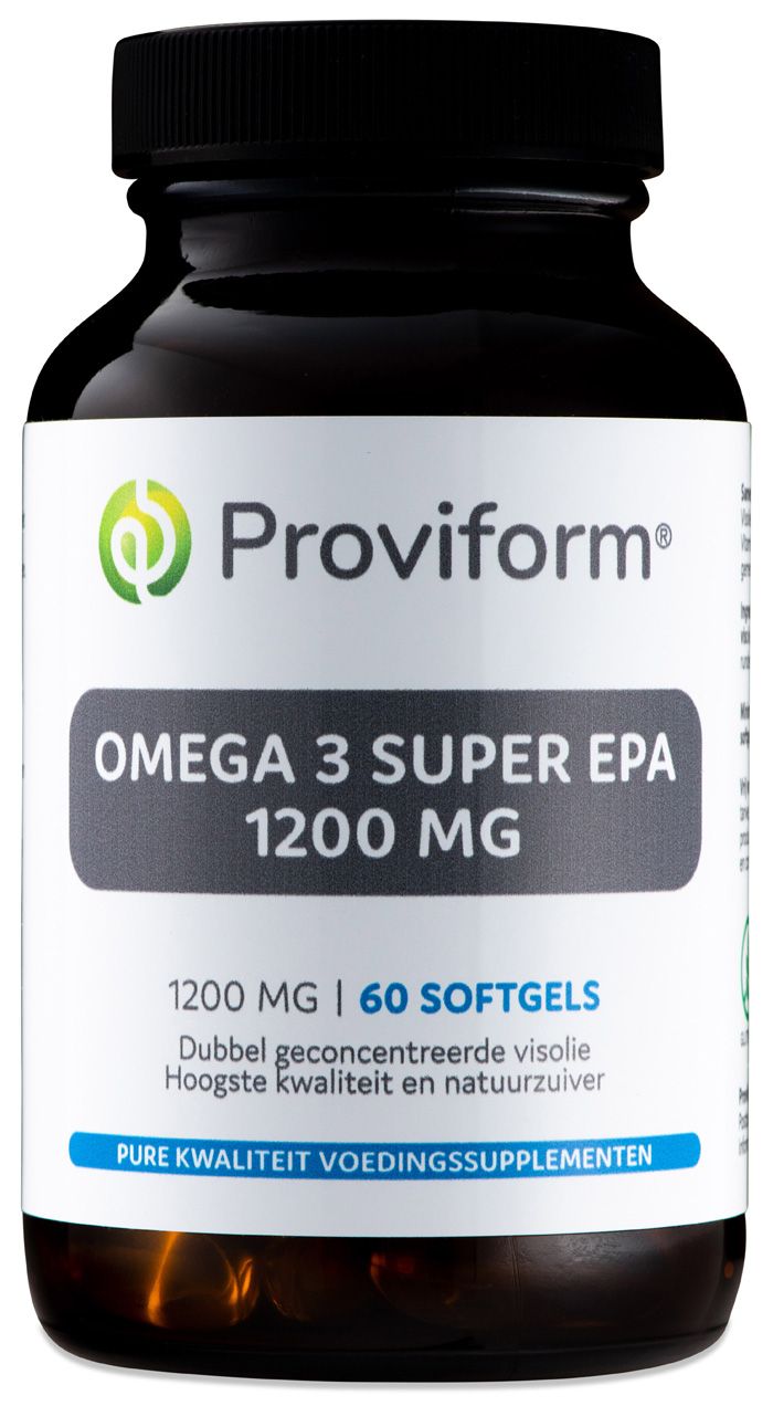 Proviform Omega 3 Super EPA 1200mg is een hoogwaardig voedingssupplement met 1200mg visolie. Dit visolieconcentraat bevat 360mg EPA, 240mg DHA en is aangevuld met vitamine E. Het visolieconcentraat is van hoogste kwaliteit en natuurzuiver.Proviform Omega 3 Super EPA 1200mg:-