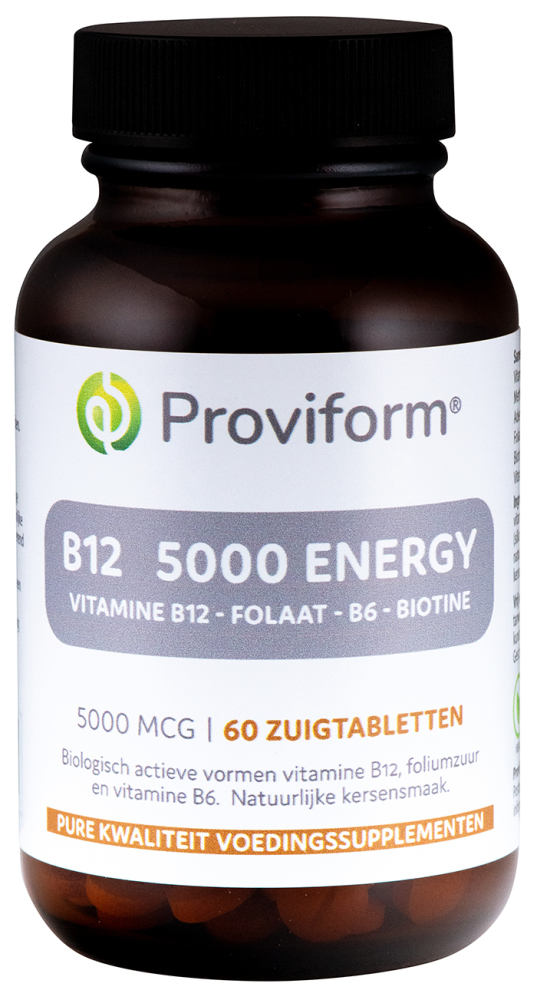 Proviform Vitamine B12 5000 mcg Energy Zuigtabletten bevat een unieke combinatie van actieve B12 en biotine. Het bevat de beste actieve B12 vormen methylcobalamine en adenosylcobalamine. Tevens wordt uitsluitend gebruik gemaakt van foliumzuur in de meest biologisch actieve