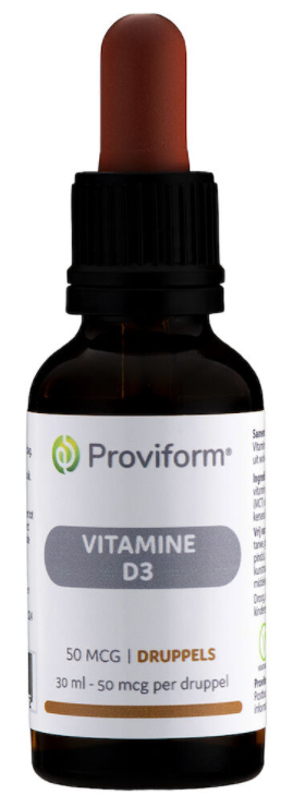 Proviform Vitamine D3 50mcg Druppels is een goed opneembaar vitamine D-3 preparaat in druppelvorm. Vitamine D draagt bij aan het behoud van sterke botten en tanden. Is goed voor de calciumhuishouding, helpt bij het celdelingsproces en belangrijk voor een normale