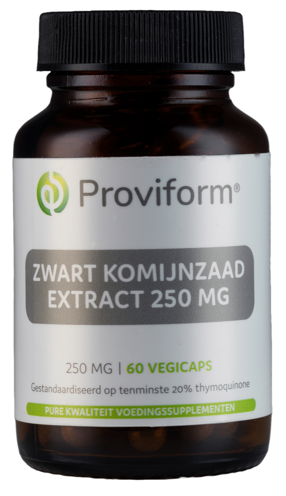 Proviform Zwart Komijnzaad Extract Vegicaps (60vcp) is een hoogwaardig voedingssupplement op basis van Nigella sativa, beter bekend als zwart komijnzaad. Zwart komijnzaad bevat van nature thymoquinon.Proviform Zwart Komijnzaad Extract:Krachtig extract van Nigella sativa