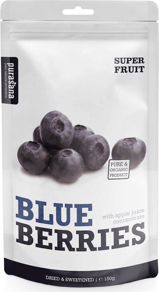 Purasana Blueberries 150 gram Gedroogde blauwe bessen: friszoet van smaak, voedzaam en zeer populair. Ze bevatten weinig calorieën en zijn voorzien van diverse vitaminen en mineralen als vitamine C, natrium, kalium, calcium, fosfor, ijzer, magnesium, koper, zink en antioxidanten. Gebruiksaanwijzing 1-2 eetlepels per portie. Kunnen uit het vuistjes gegeten worden of toegevoegd worden aan yoghurt, ontbijtgranen of milkshakes.