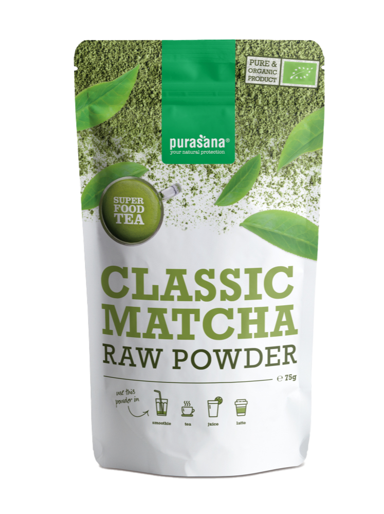 Purasana Matcha Classic Matcha Raw Powder met Japanse groene thee waarbij de blaadjes op een speciale manier zijn geplukt, gestoomd en gemalen tot poeder met een heerlijk zachte smaak. Matcha is rijk aan antioxidanten en vitaminen (A, B, C, D), vezels, chlorofyl (bladgroen)
