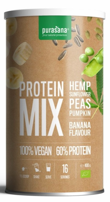 Purasana Protein Mix Banaan is een rijke mix van eiwitten op basis van erwten-, zonnebloem-, hennep- en pompoeneiwit zonder synthetische additieven. Deze mix bevat alleen maar pure en natuurlijke ingrediënten. Eiwitten zijn belangrijk voor gezonde spieren en botten. Dit