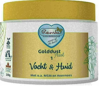 Renske Golddust Heal 1 Huid En Vacht 250 gramRenske Golddust Heal 1 Huid En Vacht in 250 gram is aanvullend diervoer voor hond of kat. Het is een hoogwaardig, 100% natuurlijk voedingssupplement dat de huid en vacht ondersteunt. Dit supplement van Renske is speciaal ontwikkeld voor dieren met een rode en gevoelige huid, haaruitval en roos en schilfers. Dit natuurlijke supplement versterkt de nagels, beschermt de huid en geeft vacht weer een prachtige glans.Renske Golddust Heal is 100% natuurlijk en samengesteld uit 99,99% biologisch, puur lijnzaad. Daarnaast is het verrijkt met Heermoesextract en visolie, en rijk aan Omega-3 vetzuren en vitaminen en mineralen. Deze combinatie heeft onder andere een ontstekingsremmende werking en is ondersteunt de ontwikkeling van hersenen en zenuwstelsel. Een natuurlijk, zeer functioneel supplement voor hond en kat!- Voedingssupplement voor honden en katten- Ondersteunt de huid en vacht- Ideaal bij rode en gevoelige huid, haaruitval, schilfers en roos- Beschermt en voedt de huid en vacht- Geheel natuurlijk, uit 99,99% puur lijnzaadSamenstelling: per 100g: Lijnzaad (Stabilized, Ground, Non-GMO, Human-Grade 99,9% puur) (Omega-3 15g/100g, Omega-6 5g/100g) (95,13%), M.S.M. (2,19%), Silicium (kiezelzuur 1,30%), Heermoes extr. (0,88%), Salie (0,5%)Analytische bestanddelen: per 100g: Koolhydraten 5g, Ruw eiwit 21g, Ruw vet 38g, Verzadigde vetzuren 4g, Meervoudig onverzadigd 27g, Enkelvoudig onverzadigd 8g, Vezels 24g, Ruwe as 3gAdvies: meng de voorgeschreven hoeveelheid Golddust Heal door de voeding van de hond of kat. Begin de eerste week met de halve dosering. Houdt u daarna aan de aanbevolen dosering. Indien nodig kunt u de dosering verdubbelen.Inhoud: 250 gr