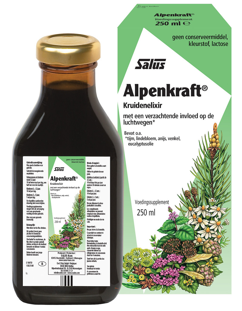 Salus Elixer Alpenkraft is een traditioneel elixer op basis van planten met onder andere tijm. Verder is het aangevuld met lindebloem, anijs, pepermunt, kamille en eucalyptusolie. Salus Elixer Alpenkraft bevat geen kunstmatige kleur- of smaakstoffen, is gezoet met onder
