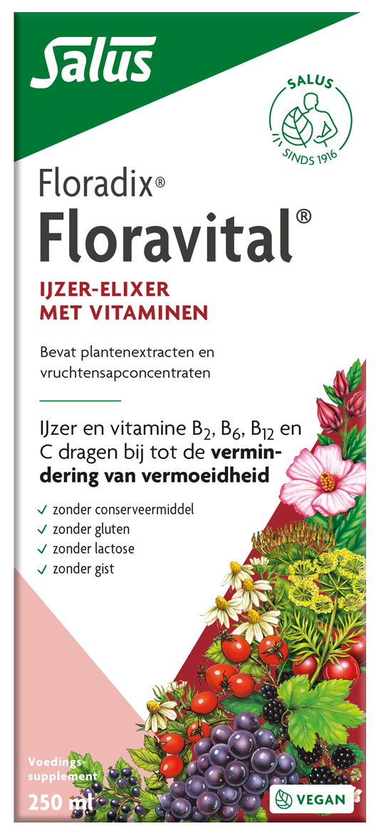 Salus Elixer Floravital is een gist en glutenvrij vloeibaar ijzer-elixir voor bij vermoeidheid. Het is de glutenvrije variant van Floradix. Het elixer is aangevuld met groente-extracten en vruchtenconcentraten. Floravital bevat een goed opneembare en goed verteerbare vorm