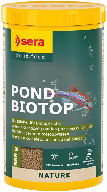De Sera Pond Biotop 1000 ml is speciaal ontwikkeld voor biotoopvissen in vijvers, zoals vetjes, stekelbaarzen, bittervoorns, elritsen en riviergrondels. Dit langzaam zinkende, zachte granulaat bereikt alle zwemzones, waardoor je vissen altijd het voer kunnen bereiken. Het komt overeen met hun natuurlijke voeding, bestaande uit insectenlarven en plantaardig materiaal. Het voer bevat 37% duurzaam insectenmeel van de larve van de soldaatvlieg (Hermetia), mannan-oligosacchariden en andere hoogwaardige ingrediënten zoals raapolie, wat zorgt voor een gezonde ontwikkeling en vitale vissen zonder kleur- of conserveermiddelen.
