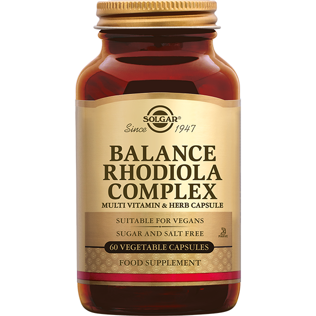 Solgar Balance Rhodiola Complex Capsules (60 stuks) is een hoogwaardig voedingssupplement op basis van verschillende B-vitaminen, vitamine C, siberische ginseng (Eleutherococcus senticosus), rozenwortel (Rhodiola rosea) en zoethout (Glycyrrhiza glabra). Solgar Balance