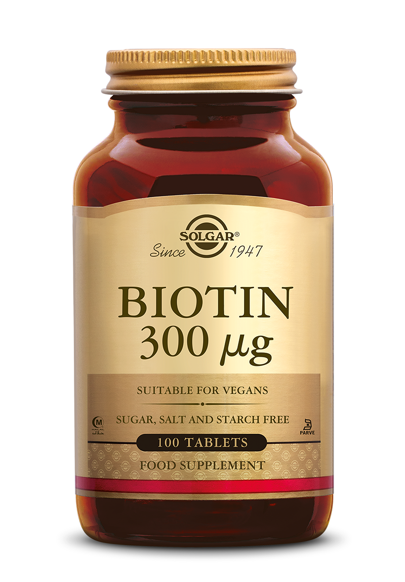 Solgar Biotine 300 mcg Tabletten (100 stuks) bevatten 300 mcg biotine per tablet en worden ook wel vitamine B-4, vitamine H of vitamine B-8 genoemd. Biotine draagt bij aan de normale haargroei, houdt het haar sterk en draagt bij aan het behoud van een normale huid. De
