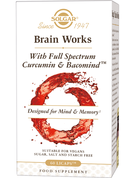 Solgar Brain Works Capsules (60 stuks) is een geavanceerd voedingssupplement. Dit unieke supplement combineert hoogwaardige ingrediënten zoals BacoMind®, Full Spectrum Curcumine en vitamine B-12 in een optimale formulering. Geschikt voor vegetariërs en veganisten. Solgar