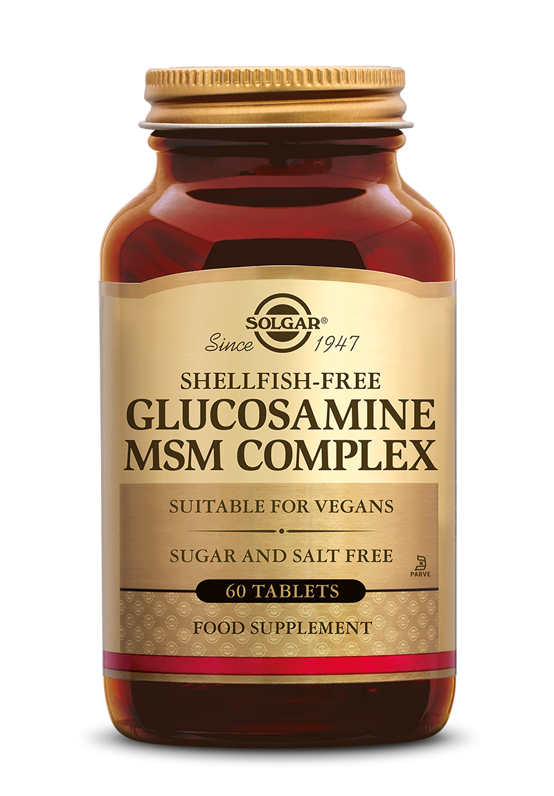 Solgar Glucosamine MSM Complex tabletten (60 stuks) bevat een combinatie van glucosamine, MSM, mineralen en kruiden. Dit geheel plantaardige supplement bevat 500 mg glucosamine HCl (415 mg elementair glucosamine) per tablet en 333 mg MSM per tablet. De donkere glazen