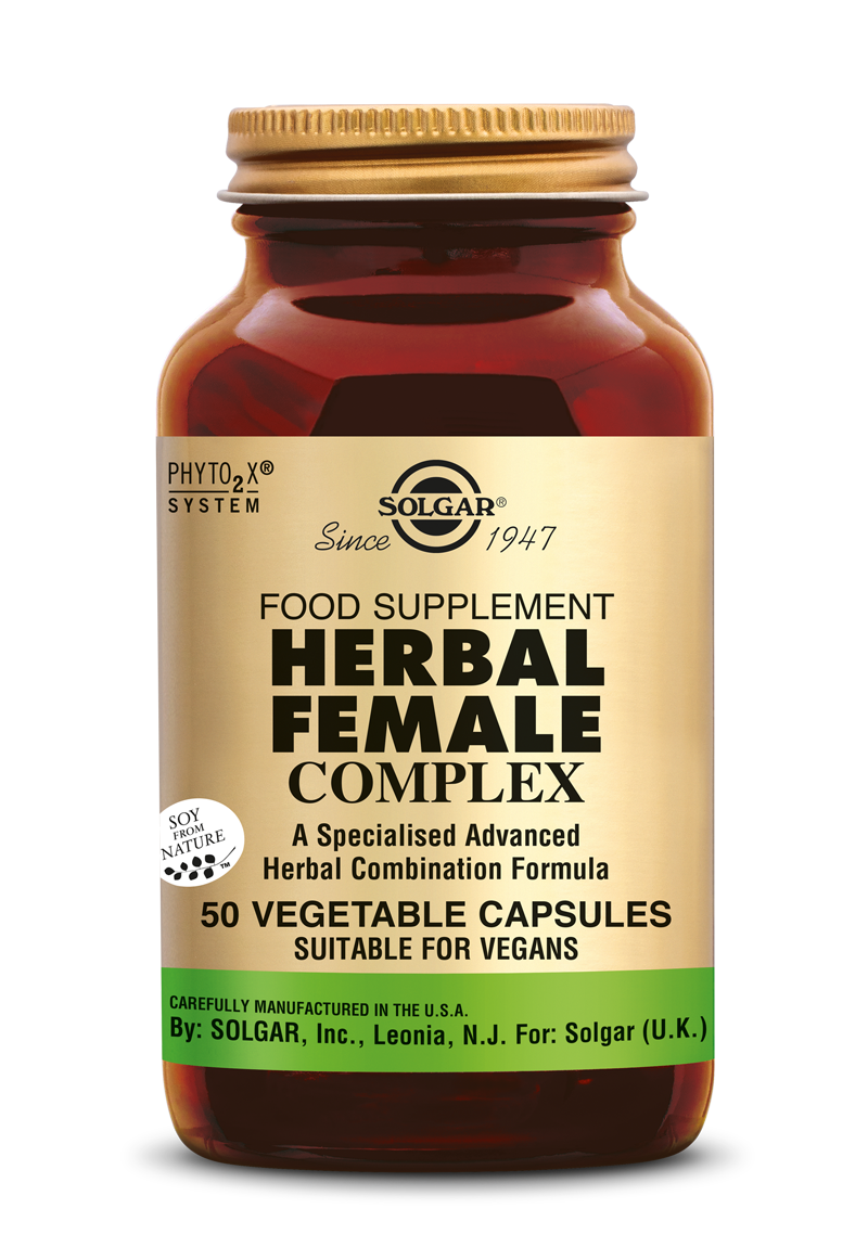 Solgar Herbal Female Kruiden Complex voor Vrouwen (50 Capsules) is een kruidenformule speciaal ontwikkeld voor vrouwen. De kruiden bieden ondersteuning bij ongemakken voorafgaand en tijdens de menstruatie en ondersteunen het natuurlijke overgangsproces. Dit supplement