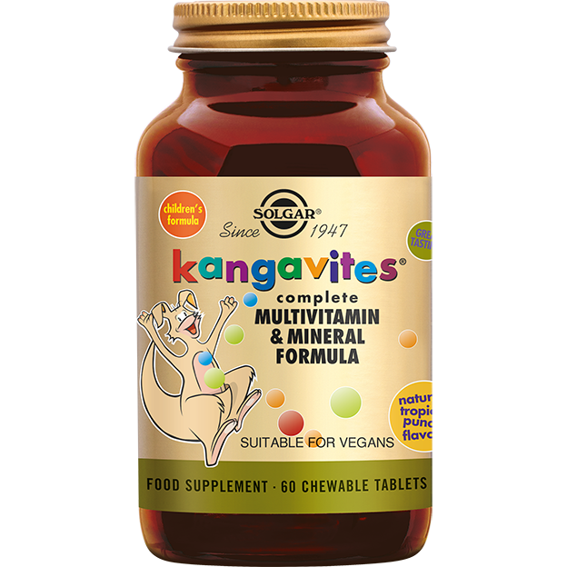 Solgar Kangavites™ Multivitamine Kauwtabletten Tropical Punch (60 stuks) is een complete multivitamine speciaal ontwikkeld voor kinderen. Deze kauwtabletten hebben een fruitige tropical punch smaak die goed in de smaak valt bij kinderen. De zachte textuur maakt ze