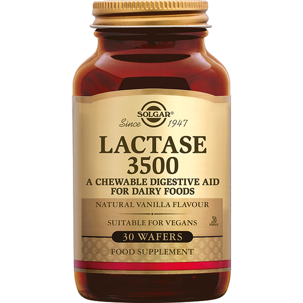 Solgar Lactase 3500 kauwtabletten (30 stuks) is een hoogwaardig voedingssupplement. Lactase-enzym bevordert de vertering van lactose (melksuiker) bij mensen die lactose moeilijk verteren. Solgar Lactase 3500 kauwtabletten: Bevat 7000 FCC lactase eenheden per